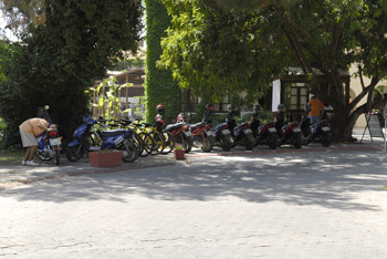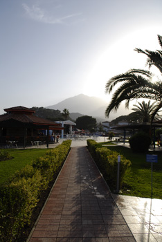 Третий день ------------------------------------------- Следующий день, позагорав до обеда и плотно покушав выбрав мотик, тот что по прочнее из всей кучи :), для езды по окрестностям, так-как есть свои правила по прокату техники и перед тем как что либо подписывать, читайте приложение внимательней, а почему после обеда, потаму как с 12-ти по 15.00, солнце в зините, почти над нами и очень жарко. Загорать, просто не реально, да и вредно. Пешком гулять, слишком долгая процедура, а на технике очень даже здорово получилось. А это, что мы видели и на чём рассекали... Очень, здорово. На отвесных камнях и такое... Всем нам любимый гранат, только не зрелый. Чем то похож на шиповник, очень большой и с большими цветами. В апельсиновых плантациях немец стоял... Прикосновение к кактусу привело вот к такому безобразию :) А вот и вечер, пора назад, до отеля. :( Это было безподобно...