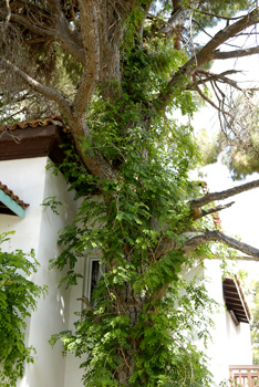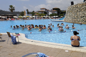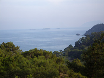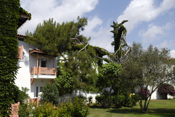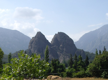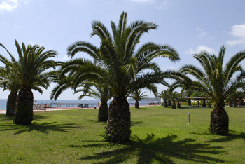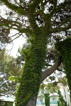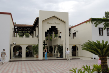 Вот мы приземлились в аэропорту Анталии. Как и обещал туроператор, обеспечивший путевками, встречали при выходе из аэровокзала. Мы предъявили ваучер - нам предложили пройти к автобусам. Было жарко (+28), но в не в автобусе с кондиционером. Прохладно и комфортно. Горы были везде. Как миражи... Конечно, мы зарядились на маленькую экскурсию, пока ехали на автобусе (целый час!). Но, увы, попался неопытный, а, может, просто ленивый, экскурсовод. От этого поездка до отеля несколько поблекла, хотя проезжали мы много интересных мест. Ехали по побережью Средиземного моря. Вид ошеломляющий, море при любой погоде прекрасно смотрится. И горы, гоорыы, ГООРЫЫЫ... Проехав город Кемер, сворачиваем у селения Чумюва. Там нас определили на довольствие :), в отеле под названием "Клуб Марко Поло" ("Club Marco Polo"). Место сказочно красивое. Зелень, сосны, горы повсюду. Двухэтажные гостевые домики, крытые глиняной черепицей, с белыми стенами, кое-где сплошь затянутыми зеленью. Цветы, сосны причудливых форм, вокруг которых бережно развёрнут отель. Просто здорово, как в сказке. Первым делом нас всех собрали на ресепшн, предложили чай и кофе, раздали анкеты и выдали ключи. Спальня, встроенный шкаф для белья и верхней одежды, там же сейф с инструкцией по пользованию (всё просто, но нелишним будет закрыть-открыть без содержимого, а уж потом эксплуатировать). В санузле внушительный тюльпан, зеркало, душ, тут же унитаз. Полотенца меняют каждый день - только оставь их на полу. Постельное бельё - через 2 дня. В спальне просторная кровать, зеркало-трюмо с тумбочками, пара кресел, встроенный холодильник и телевизор с пультом. Кондиционирование во всех комнатах. Да! Ведь комнат было две. Кроме спальни, ещё комната для детишек на две персоны (двухярусная кровать). В общем, всё понравилось. Мы приехали в районе пяти по местному времени (в Турции мы перевели часы на час назад ) и, бросив сумки с вещами, устремились к морю. Через пару минут мы очутились на большущем пляже посреди моря... Бескрайнего. Надо ли говорить? Было незабываемо красиво. Диковинки на территории отеля. ------------------------------------------------------