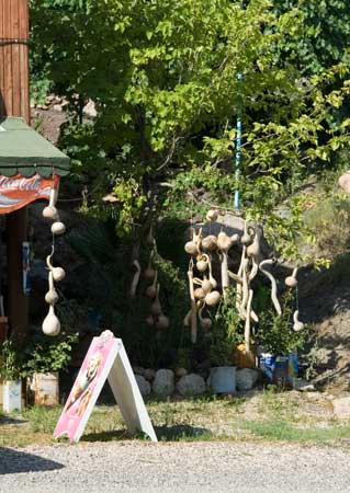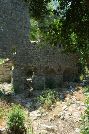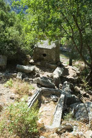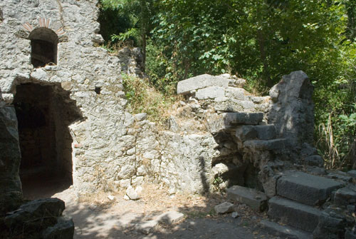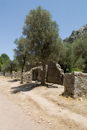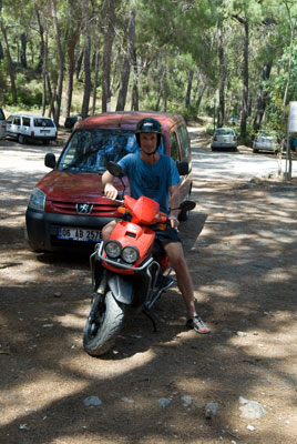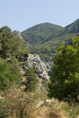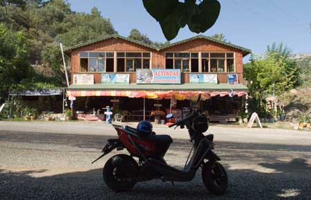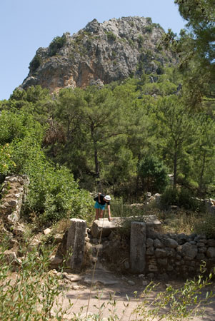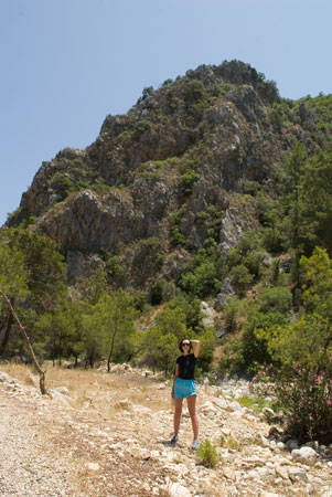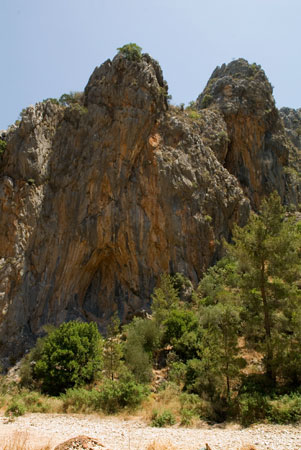 Так-как мотик был взят на прокат на целый день, решили махнуть куда нибудь по далее. Среди близлежащих интересных мест был Олимпос (Olympos). Проехав порядка 35 км. свернули у дорожного знака "Olympos 4km". По крутому серпантину четыре км. спустились в ущелье и обалдели от размеров этих каменистых нагромождений, которые нависали на нас.