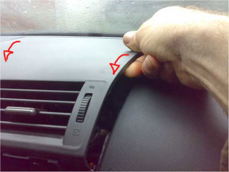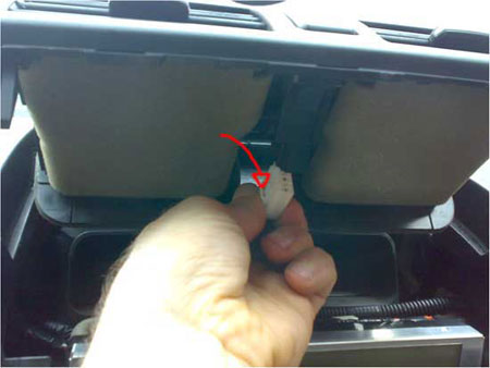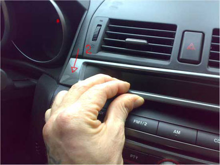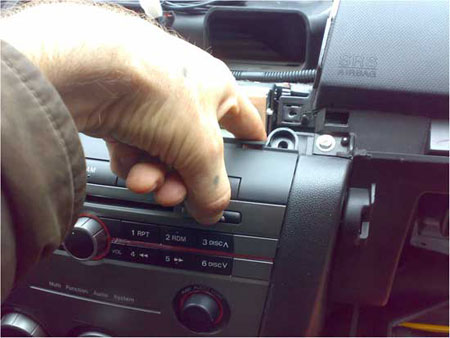 Засовываем указательные пальцы за переднюю панель ГУ слева (фото 16). С легким усилием тянем на себя придерживая другой рукой, тем самым, снимая ГУ с нижних клипс. ГУ должно выйти вперед на 1-2 см.