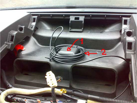 GPS-антенна, была приклеена на двухсторонний скотч (фото 15.1). Это некритично, можно воспользоваться и другим креплением (учитывайте экстремальный, температурный режим). Данное размещение антенны под пластиковой панелью воздуховода не мешает уверенному приему спутников и непортит внешний вид интерьера авто. Излишки антенного кабеля были накинуты на корпус GPS-антенны (фото15.2)