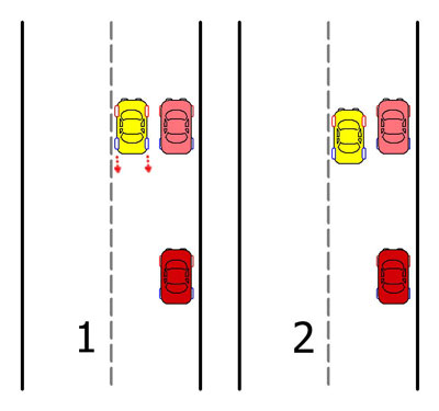 Включив аварийный сигнал, а затем заднюю скорость, начинаем движение назад. Поравнявшись вашим правым задним колесом с задним бампером впереди стоящего автомобиля расположенного справа (2). ОСТАНОВИТЕСЬ.