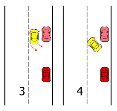 В этой фазе быстро выкручиваем руль в правую сторону до упора (3) и как можно медленнее, продолжаем движение. Двигаясь назад, вы должны перевести взгляд на левое зеркало заднего вида и контролировать его до тех пор, пока по касательной вашего левого борта не появится автомобиль стоящий сзади вас, а именно правое крыло (можно взять за маяк правую фару). Только после этого мы ОСТАНАВЛИВАЕМСЯ, закончив вторую фазу (4).