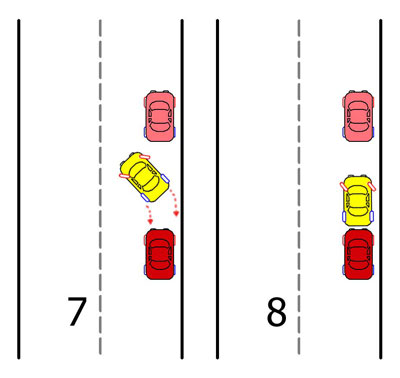 В очередной раз выкручиваем руль до упора в левую сторону (7). Продолжаем движение, наблюдая за своим правым углом переднего бампера и левым углом заднего бампера впереди стоящего автомобиля (7). Как только вы удачно разъедитесь бамперами, все внимание устремляем назад, смотря в левое зеркало заднего вида и контролируя борта обеих авто и дистанцию между ними. Как только левый борт вашего и левый заднего автомобиля поравняются по касательной, можно остановиться (8).