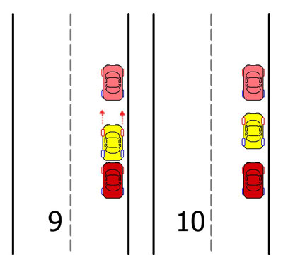 Выровнять авто относительно впереди и сзади стоящих, предварительно повернув передние колеса прямо (9-10).