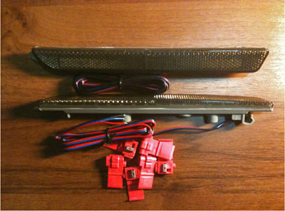 Катафоты задние... Поглядев на фотографии доработанных машинок маздоводов на drive2.ru, пришел к выводу, что катафоты со светом очень даже ничего. На фотографии приобретенный комплект. Контактные адаптеры и пара катафотов (Фото 1).
