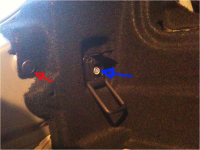 ...так же отвертываем, крепление сетки багажника торцевым ключем на 10мм (синяя стрелка, красная стрелка это клипса которые следует вынимать везде, где мы их будем видеть. Поддев центральную площадку чуть ли не ногтем, она очень легко вынимается руками). Незабываем те места где стоят клипсы (фото 11).