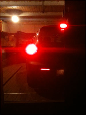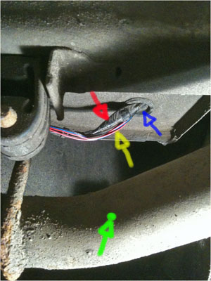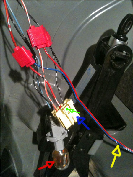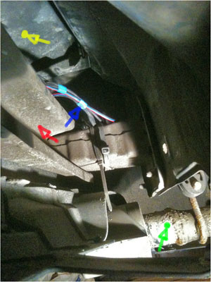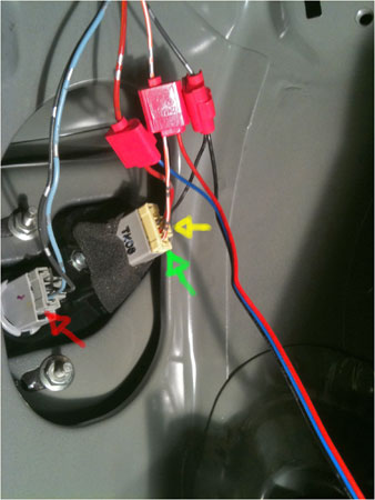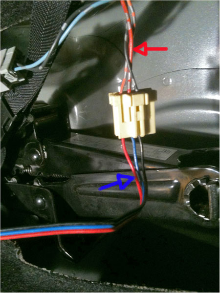 Пример тестового соединения светодиодного катафота, предварительно нужно снять родной (как снять катафот, расказано здесь),поставить наш тюнингованный, провздев провода в отверстие защелки для катафота у бампера. Придется подстелить что то под бампером, леч на спину и окуратно протащить и закрепить провода за бампером (под рукой была изолента, вот ей и закрепил за монтаж датчиков парковки, если нет, то там имеются технологические ушки, нащупать их можно только руками за балкой заднего бампера фото 26). Дальний, правый катафот провел по металлической силовой балке бампера и параллельно с левым протощил через тех.отверстие (фото 6; 7; 23; 24). Вытащил провода от катафотов в багажник. Красной стрелкой показаны провода идущие на разъем для запитки стоп-габарита. Цоколевка справо на лево: Синей стрелкой показаны провода идущие от левого катафота, там объяснять цоколевку ненужно, все и так понятно (фото 14). НЕ ПЕРЕПУТАЙТЕ ПЛЮС И МИНУС, ЭТО ГРОЗИТ ВЫХОДОМ ИЗ СТОРОЯ СВЕТОДИОДОВ :(